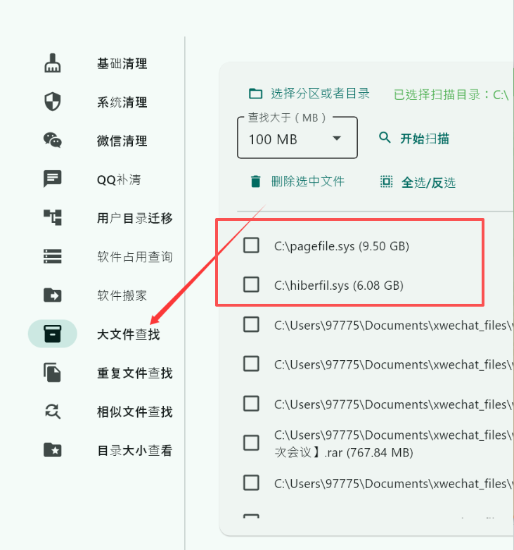 红框框起来的这两个文件不能被删除,c:\pagefile.sys这个文件请使用系统清理里面的转移虚拟内存功能,c:\hiberfil.sys请使用系统清理里面的关闭休眠功能